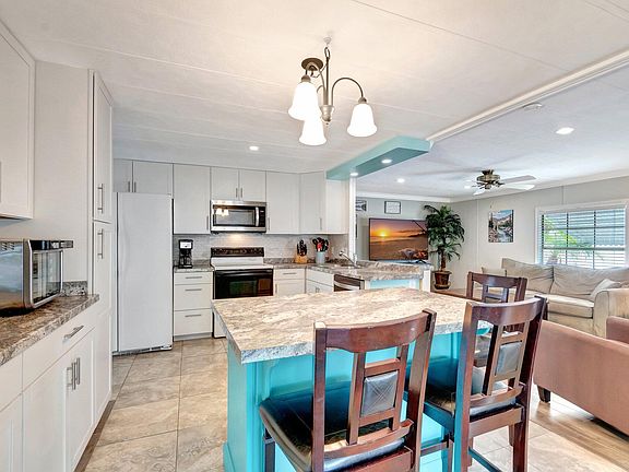 This bright open floor plan provides an abundance of natural light through beautiful bay windows located on a corner lot with NO LAND LEASE. The 2 bed / 2 bathroom home includes an updated kitchen (2023) with an oversized island and plenty of cabinets for extra storage, newer appliances, updated flooring throughout, crown molding, framed windows, updated guest bath, walk in closets, updated tiled lanai to enjoy the beautiful Florida weather! The LOW monthly HOA fee covers internet, lawn care, water, sewer, trash removal, 24/7 manned gate, on-site management, amenities including multiple heated pools, library, clubhouse, billiards, shuffleboard, bocce ball, putting green, dog park, additional storage for boat / RV / motorcycle, plus many social activities throughout the year!