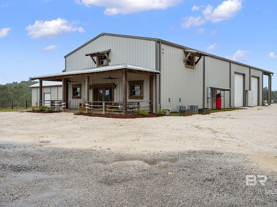 Embrace the possibilities on this 9-acre property at 14002 County Road 13, Fairhope, where open space and functional structures create endless opportunities for living, working, and recreation. Featuring a 4,480 sq. ft. barndominium with 2,000 sq. ft. of heated and cooled space currently set up with 4 offices and a half bath, and an upstairs living area with 1 bedroom, 1 bathroom, an open living space, marble kitchen countertops, walk-in closets, and a private balcony overlooking serene landscapes. The rear section includes a 40x62 workshop with large roll-up and bifold doors, while an additional 42x50 building with multiple roll-up doors provides extra storage or workspace. This property is a rare find for those seeking versatility and tranquility in one location. Subdivision of the 29-acre parcel is subject to Baldwin County approval. See MLS# Buyer to verify all information. Buyer to verify all information during due diligence.