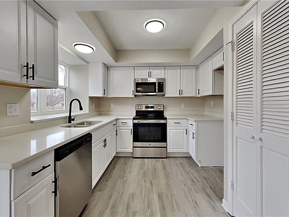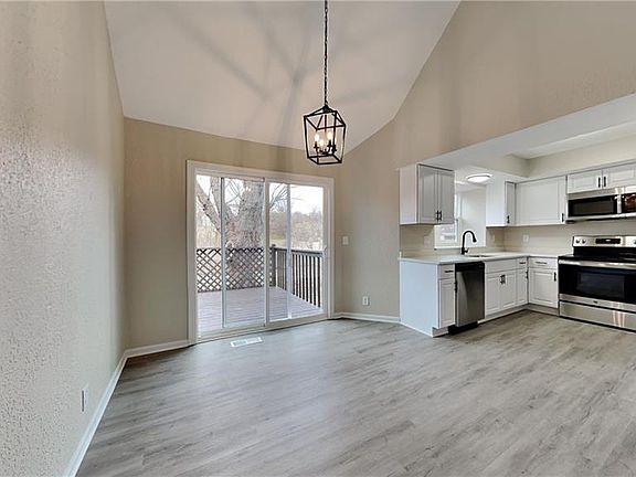 Check out this updated home located in a peaceful neighborhood! This beautiful floorplan boasts fresh interior paint, new carpet and flooring throughout, new stainless steel appliances (range, microwave, and dishwasher), new quartz kitchen counters, and updated baths with new subway tile showers. The new doesn't stope there - New roof and interior paint completed December 2023. Entertain in the bright main floor living room with vaulted ceilings and a statement fireplace, enjoy a dining space with access to the spacious recently painted back deck, that looks out to a peaceful treeline (that's especially gorgeous during spring and summer)! Close to shopping and restaurants in Olathe. Make this home yours today!