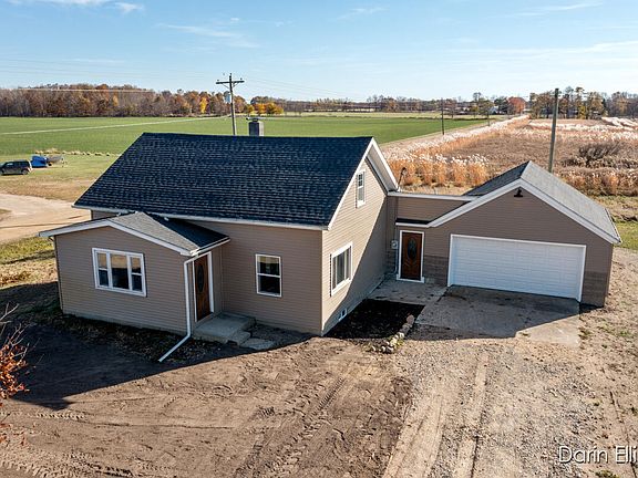 Completely remodeled and updated 1750+ sq ft, 4 Bed, 2 Bath home with a beautiful country setting. Wide open floor plan starting with brand new kitchen with new counters, cabinets, huge snack bar, pantry, and all new appliances. Large mud room, main floor laundry, and Main floor primary bed. New flooring, wall coverings, replacement windows, new fixtures and doors throughout including remodeled bathrooms from top to bottom. All solid panel interior doors. Home is mechanically sound with new water heater 5-year-old furnace, all new plumbing and electrical upgrades. Brand new roof, vinyl siding, well, septic and the list goes on. The icing on the cake is the attached 2-stall fully drywalled garage. 1/2 + Acre corner lot w/unlimited open field views. School of choice is easy as buses go by!