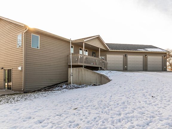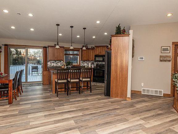 This beautiful property sits on 1.5 acres in a quiet neighborhood just north of Bismarck! As you make your way to the front door you will notice the nice front porch area where you can spend time relaxing and enjoying the fresh country air. When you enter this 5 bed/4 bath home you will be greeted by the living room, dining room, and kitchen providing an open concept. Take note of the all new vinyl plank flooring that was just installed on the main level! Near the kitchen is the main floor laundry room with a 1/2 bath, and also access to the heated 3 stall garage that has a floor drain and H/C water. The kitchen itself has stunning hickory cabinets, a nice sized island, and a pantry! Off of the dining room is access to the large maintenance free deck that overlooks the backyard and beautiful mature trees surrounding it. Down the hall from the living room you will find the primary bedroom with a private en-suite with a full bath and walk-in closet. There are two additional bedrooms and another full bath. Downstairs is the walk-out basement boasting a large living room space with a gas fireplace, bar area that is plumbed for a wet bar, 2 more bedrooms, and a full bath. This 3000+ SQFT home has new shingles, Anderson windows throughout, and LP Smart siding. There's a camper pad on the west side of the garage that has an electric hookup. Behind the home is a 35x56 shop with two 14ft doors, in floor heat (electric), and its own septic system. New roof to be installed this fall. Don't miss out on this rural property! Contact your favorite agent today!
