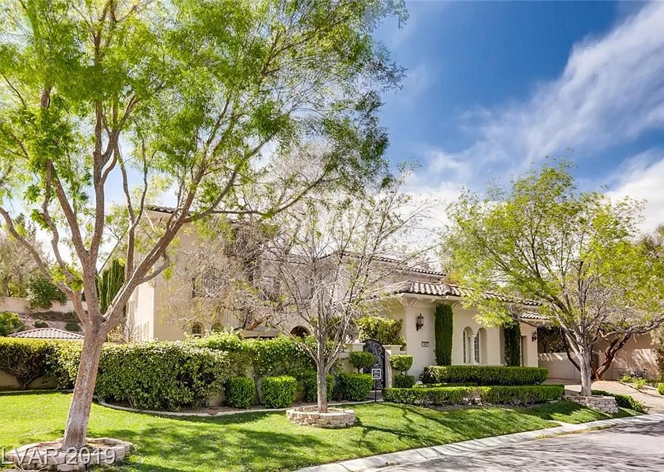 Summerlin!Guard gated!Stunning home in the Vineyards located at end of cul de sac featuring beautiful courtyard entry w fp.Main house 5 bdrms & 4 full baths+440 sq ft detached casita w 3/4 bath & its own covered patio!Kitchen w/3ovens,granite counters&island,wi pantry,built in desk open to fm rm w/fireplace &custom built in.Backyd is entertainers delight w/3 cov patios& massive 18'x65' saltwater pool.Freshly painted!Close to fwy/shopping/schools.