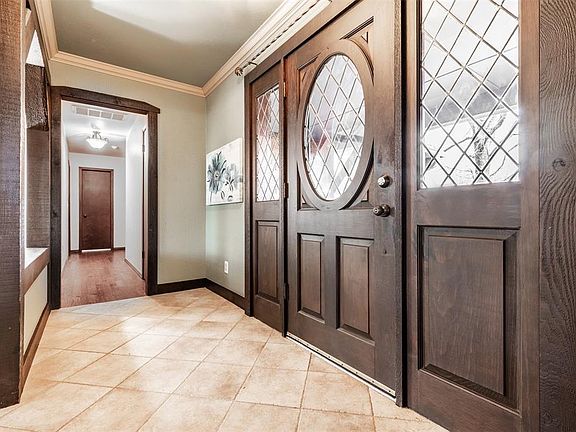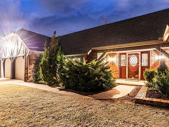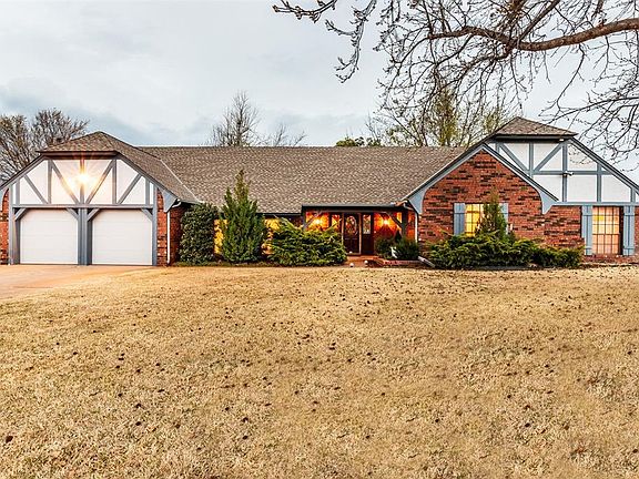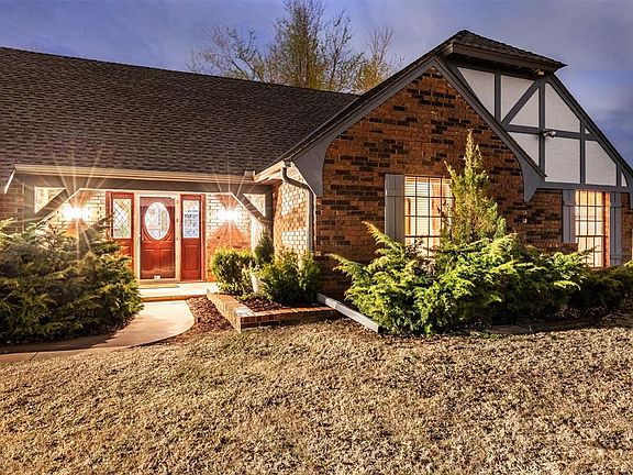 RARE OPPORTUNITY for idyllic Tudor style home sitting eloquently on a 2.14 acre corner lot with impressive, insulated and sheet rocked barn with electric and 220 capability in Sorghum Mill Estates in Edmond! Great location! 3 bed | 2.1 bath| 2029 sf. Leaded glass windows adorn the front door and formal dining room. Large family room with brick fireplace, Pullman vault with cross beam ceiling and random pegged planked hardwood floors. Drink up the big Oklahoma sky on this Pergola covered back patio with fenced area. Updated kitchen with beautiful cabinets, granite countertops, tumbled marble back splash, under mount sink, can lighting, and island that opens to breakfast room with built in matching and interior lit china cabinet and buffet. Oak hard wood floors are in the formal dining room, hallway, and primary bedroom. Ensuite bath has granite counter top and well-lit dressing area, walk-in closet and large shower. 2 more bedrooms share an updated bathroom with granite countertop and tub. Updated utility room with matching cabinets and 1/2 bath with granite. 2 car attached garage with auto opener. DO NOT MISS this 30' x 48' barn with cupola, extra large doors, insulated and sheet rocked walls, high ceilings, and electricity. Explore the rest of this beautifully landscaped and cared for acreage with Rainbird sprinkler system. Home uses City of Edmond water while sprinkler system uses private well. Excellent location. This home brings together the best of both worlds- Rural charm with Edmond conveniences close to shopping, restaurants and Mitch Park that has walking trails, playgrounds, skate park, basketball courts, amphitheater and more. Home has two electric water heaters. Wonderful neighborhood. Edmond schools!