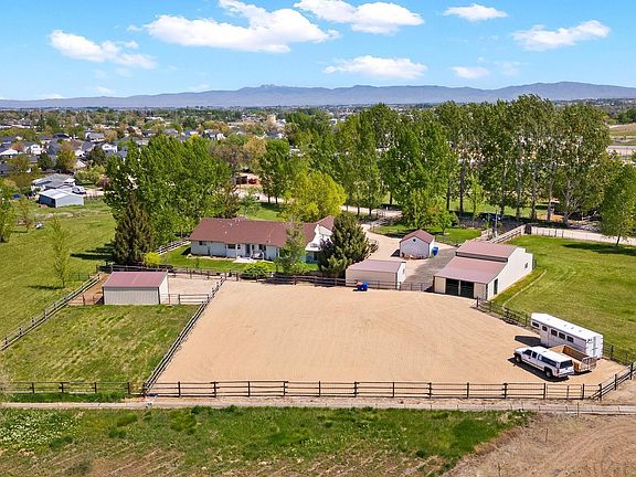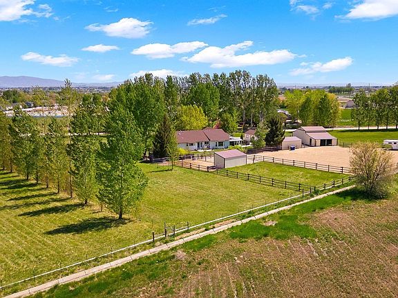 Nestled on a private lane, charming farmhouse offers timeless appeal & peaceful country living. Kitchen features granite countertops. large windows fill the home with natural light & offer stunning views of the pasture & open land. spanning on 7 acres, it is perfect for animal lovers. Includes a sand riding & turnout arena,2 large paddocks, cross-fenced irrigated pastures with gates for grazing rotation.The spacious barn 24X60 includes 2 built-in stables with multiple gates,2 tack rooms, tractor storage,100-amp panel with 110v outlets & a 220v connection, frost-free hydrants, hay storage with high double doors. Multiple corrals with secure gates, 2 outdoor stalls. For hobbyists or car enthusiasts, it includes 3 additional garages,1 insulated with a roll-up door, 100-amp panel,110v & 220v outlet for a furnace, compressor, or welder.Includes electric furnace & ductwork.Outdoor RV hookup. With irrigation rights, maintaining the land is simple. A rare opportunity to enjoy country living with modern convenience.