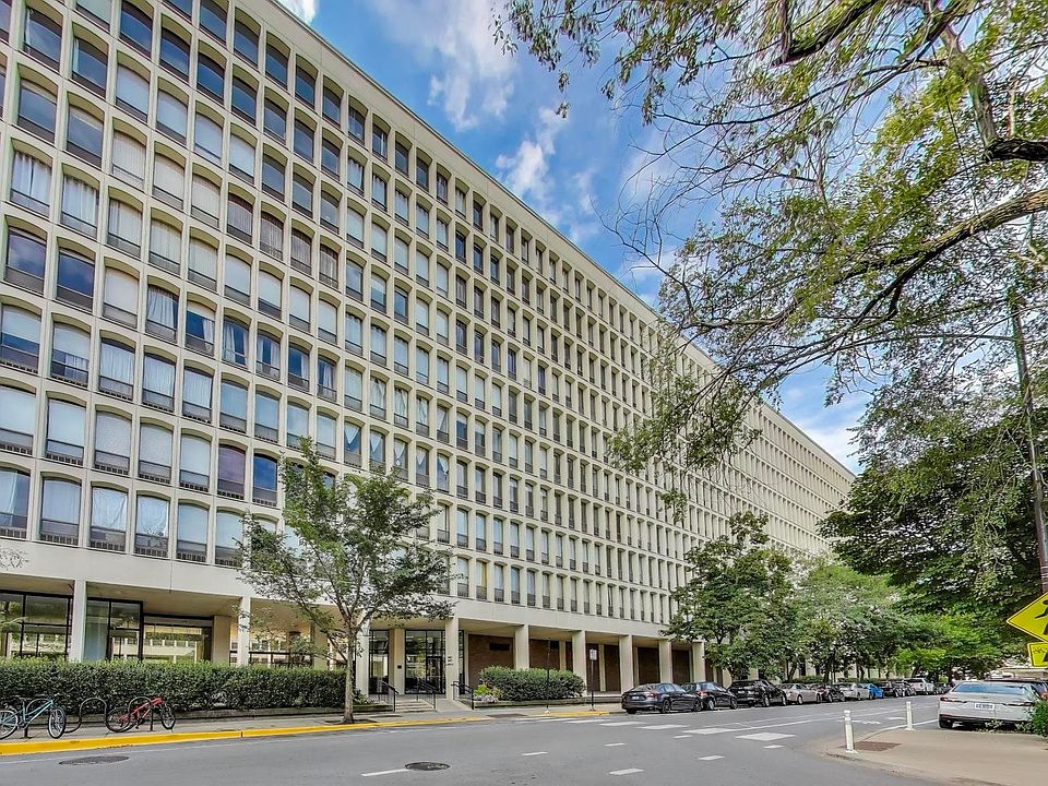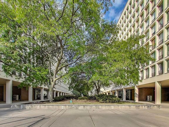 Located near the University of Chicago campus, this corner condo with beautiful sunset views looks out over a neighborhood of mature trees and university buildings. The distinctive I.M. Pei design shines through the arched windows which flood the apartment with natural light and help to blend the modernist architecture with the natural elements and open spaces below. The main living space has wood floors and ample room for both dining and living areas. The kitchen, equipped with stainless steel appliances including a brand new stove and refrigerator, has plenty of storage and counter space. Both bedrooms have brand new carpet and are roomy enough for king or queen size beds along with space for a desk and other furniture. The bath inside the primary bedroom has a full size tiled shower stall and an original porcelain sink and faucet. This pet-friendly building is perfect for investors looking to rent to University students or anyone wanting to live in the heart of Hyde Park. Enjoy easy access to the lake, vibrant nightlife, shopping, and dining while only a short commute to downtown. The building has attentive management, great security, and a large engineering staff. Extra amenities include a lovely pool, an exercise room, three parking spaces in the garage, a storage locker (#192), and an impressive courtyard anchored by a beautiful fountain. The building's assessment covers heat, water, gas, cable, internet, and on-site management. The apartment has three brand new air conditioners, is freshly painted, and ready for you to move in.