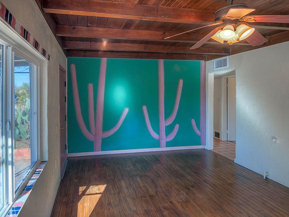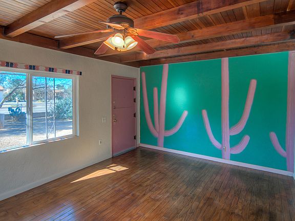 Back on the Market! So convenient to UA and just off the Mountain Avenue Bike Path, this classic 1949 masonry/stucco Santa Fe is well-maintained and move-in ready with home warranty included. This home features double-pane windows, a new gas kitchen range, ceiling fans throughout and is freshly painted. The beautiful living room features hardwood floors, beamed ceiling and even a wall mural by a Tucson artist. The two bedrooms have lots built-in storage space and gorgeous beamed ceilings, and the master has hardwood floors as well. Outside you will find a shady back yard with covered porch and a large brick patio. Convenient to UA, and great coffee and dining along the Campbell Avenue corridor.