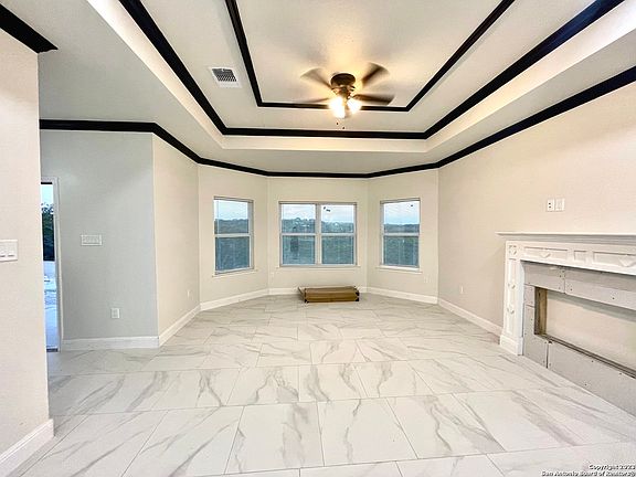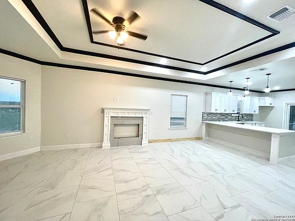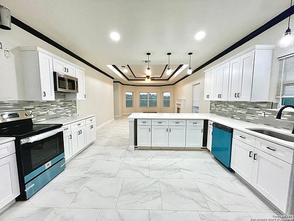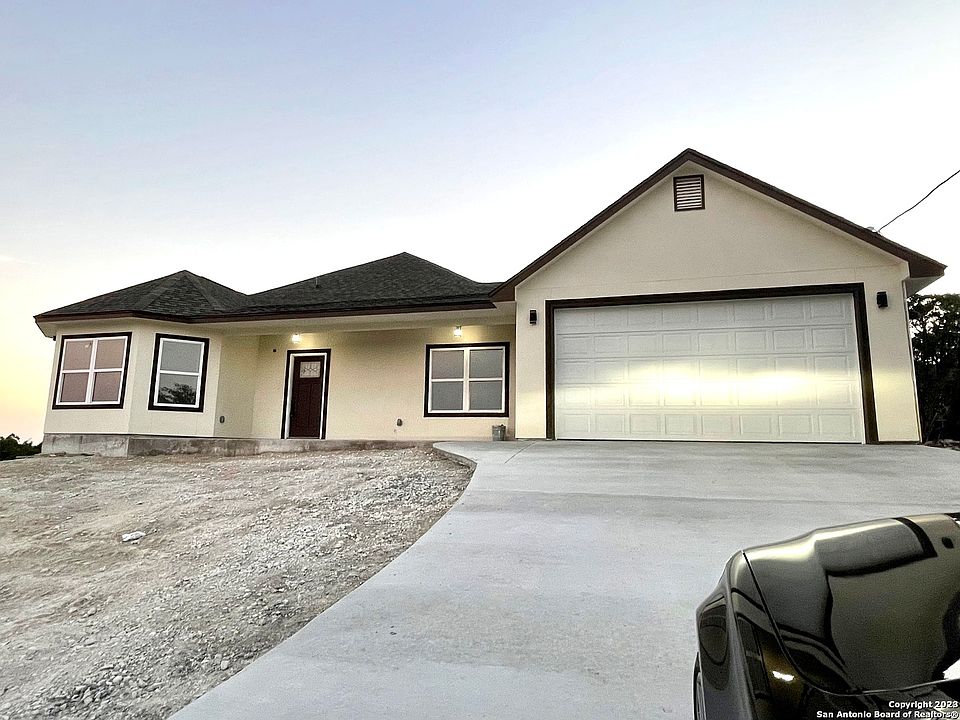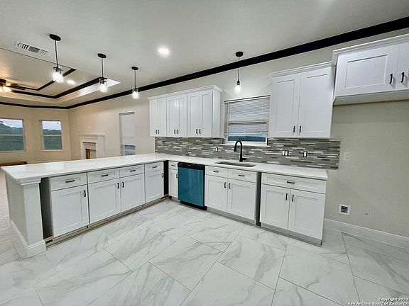 GREAT PRICE on this New Construction Home. Move in ready! With a Beautiful open floor plan and high cathedral ceilings, 3 bedrooms, 2 bathrooms, 2 car garage, open kitchen with stainless steel appliances, a large quartz counter top easy to entertain and easy to clean. The spacious living area has a beautiful electrical fire place that makes this area nice and cozy. The master bedroom has a huge walk in closet and a beautiful rain shower in bathroom. Ceiling fans and window coverings in all bedrooms it comes with a water softener and a camera doorbell. Tile throughout. Nice and large cover patio with a beautiful and level backyard. Enjoy the views in this private and quiet area of Lake of The Hills Subdivision. Voluntary HOA and no City Taxes. Just minutes away from San Antonio, Austin & New Braunfels. Please call agent for aditional information.
