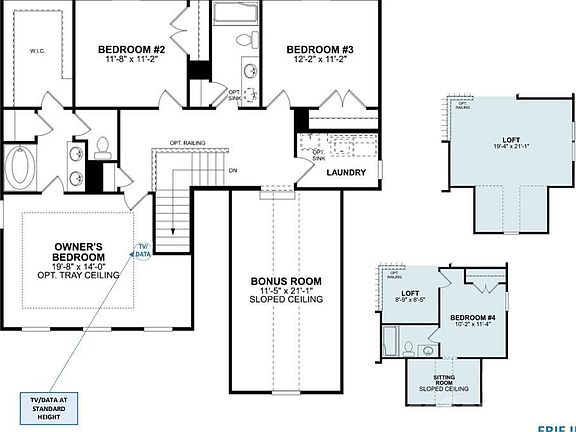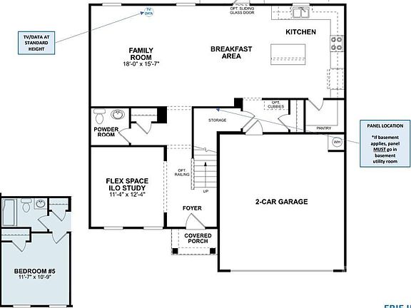 Discover your dream home with the Erie II! This 2-story residence offers a fantastic single-family layout, providing options to meet your specific needs. The front of the house features a bedroom and a full bath, creating a welcoming space for guests to unwind during holidays or extended visits. The spacious family room is ideal for hosting guests, seamlessly connecting to the breakfast area and kitchen. The kitchen boasts a center island, ample countertop space, and a large pantry. A sliding door in the breakfast area opens to the extended back patio, perfect for enjoying sunny days. Storage is abundant, including a sizable closet under the stairs. Upstairs, two secondary bedrooms flank a full bathroom, featuring an additional bowl in the vanity for added convenience. The loft provides flexible space for various uses. The private suite is a homeowner's haven, featuring a wall of windows, an enormous walk-in closet, and a luxurious bathroom with upgraded shower.