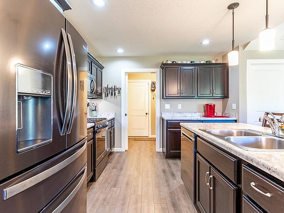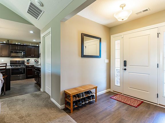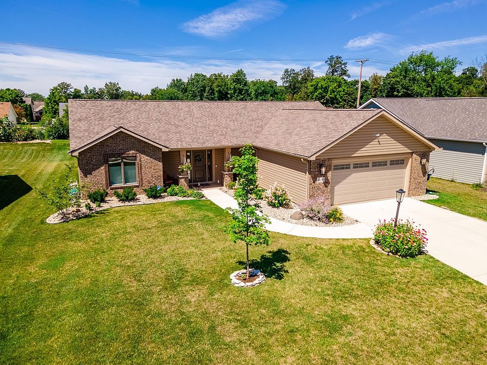The cabinet lined island kitchen features custom hickory-stained cabinetry with solid surface counters, a breakfast bar and walk-in pantry. Upgraded Stainless Appliances include a gas range, dishwasher and microwave. The open great room has a cathedral ceiling and large windows overlooking the backyard. The master suite offers a private entry. A large walk-in closet provides plenty of space along with a full bathroom complete with a linen closet, and 6' wide double sink vanity. Just off the garage is a spacious laundry room with shelving. This home also offers Andersen high performance windows. You will love the new, quality built by W.A. Zimmer company, pergola with power sunshade to enjoy on the oversized concrete patio! Enjoy storage in the attic or storage shed that stays with the home!