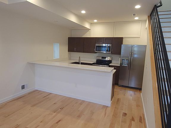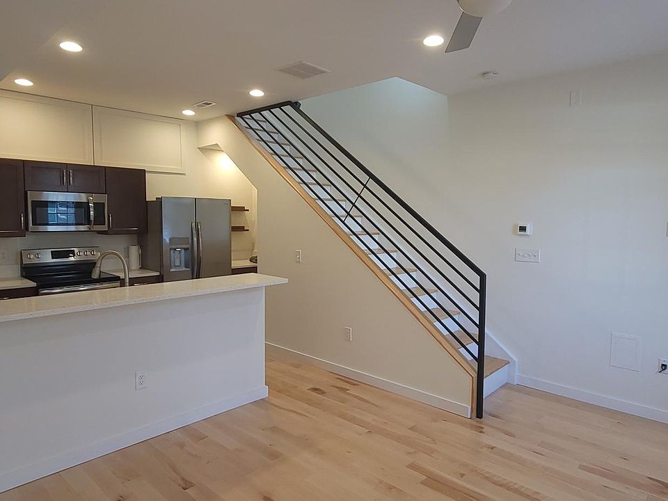 This two-story apartment is a top-to-bottom BRAND NEW rehab with PARKING No detail has been left out. Enter into a light-filled open floor plan with 9-foot-plus ceilings. The first floor features a living area and kitchen. All hardwood floors, breakfast bar, quartz countertops, soft close cabinets, coffee station, lazy susan cabinet, trash/recycle bin, dishwasher, garbage disposal, large frig, microwave, electric stove, under cabinet lighting,...the list goes on! Ample storage under the stairs rounds out this first floor. Upstairs you will find original hardwood floors, a laundry closet with stacked front loading W/D, a HUGE spa bathroom, and a large bedroom with large closet space! All windows in the bedroom and living area have cordless mini blinds and dimmers. Central AC and ceiling fans. Top to bottom all the amenities you need, no stone left unturned!! Water is included you pay utilities. One off street APRKING is included in the rent as well. No smoking, No pets allowed. Please call me to schedule your showing today! Owner pays water, one year lease