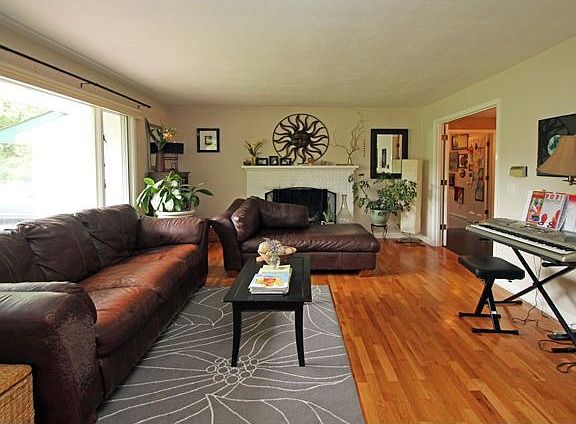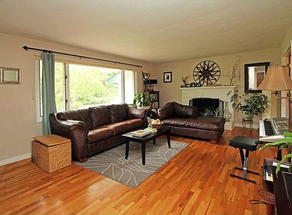 Beautifully updated Ferry St Bridge one level with hardwood flooring, vaulted ceilings, newer vinyl windows, skylights, woodburning fireplace, and gourmet kitchen w/granite counter on island w/eating bar, microwave convection oven, and gas cooktop range! Master offers a vanity w/2 sinks, jetted tub, walk-in shower & tile floor. Garden area, raised garden beds, deck and nicely landscaped with sprinklers!