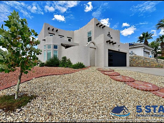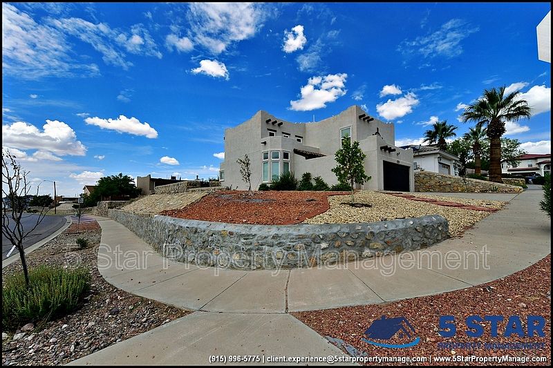 Timeless architecture meets modern comfort in this elevated corner-lot gem. With a commanding presence, this two-story stucco residence features crisp lines and xeriscape landscaping for both style and sustainability. The interior impresses with dark wood-look tile floors and an abundance of windows that infuse each room with natural light. A grand staircase anchors the living space, while the open-concept design flows effortlessly into the granite-appointed kitchen and family room with wood beams and fireplace. Upstairs, retreat to a spacious primary suite with serene views and a custom walk-in closet. Step out back to enjoy a covered patio and vibrant green turf, ideal for El Paso's year-round sun. Conveniently close to shopping, dining, and hiking trails near the Franklin Mountains. Deposit-Free Renting service to Obligo qualified renters, fees may apply. By: 5 Star Property Management | EL PASO Texas Rentals | EL PASO Property Management | Property Management in EL PASO *Important: Information is deemed reliable but not guaranteed. All information is submitted subject to errors, omissions, change of price before the lease, or withdrawal without notice.