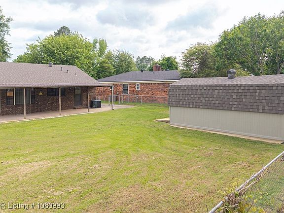 This beautifully renovated 3-bedroom, 2-bathroom home is conveniently situated in Fort Smith, near the Arkansas/Oklahoma State Line. Both the roof and hot water tank are about 2 years old. The kitchen features modern white appliances, including a gas cooktop, double ovens, built-in microwave, and refrigerator. Updated paint complements the primary bathroom's new walk-in shower and the guest bathroom's tub-shower combo. The den boasts a wood-burning fireplace, and there's a second living room near the entryway. A versatile room between the laundry and kitchen can be used as an office or hobby space. The garage includes an additional storage room. The spacious backyard is fenced, featuring a shaded, covered porch. The newly painted storage building is included with the home.