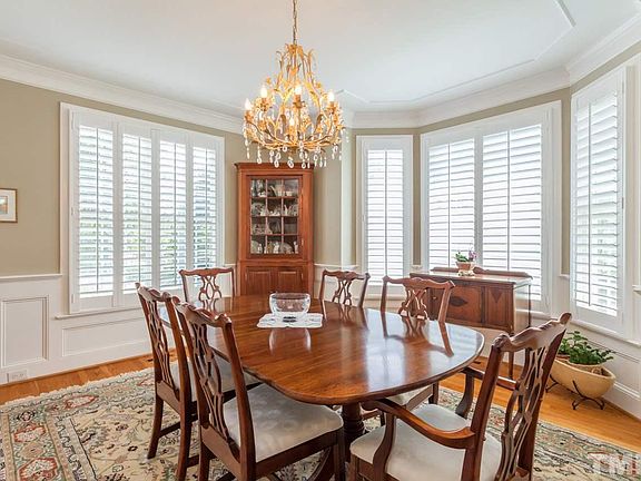 Impeccably maintained, entertains well. Architect-designed, brick, quiet, easy commute to RTP/ downtown. Moldings + hardwoods throughout, chef's kitchen ample work space, stainless + storage galore. Dining for 12. Fam room w/ built-ins, fireplace, private office + laundry room. Master w/ 2 walk-in closets + built-ins, 4th BR/ bonus w/ high ceilings + private bath. 3rd floor attic plumbed, ready to finish. 2.5-car gar w/ cabinets. Covered BK porch, large Ipe deck + patio with cozy yard+ beautiful sunsets.
