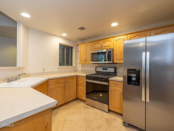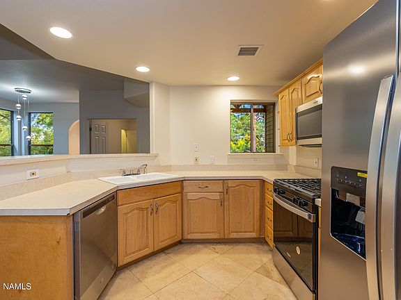Photos coming! This perfectly planned condo provides two bedrooms with walk in closets and an open living area. Featuring all brand-new Stainless-Steel Appliances in Kitchen, and new washer/dryer, fans in primary and living room and lights in Dining and bedrooms. Fresh Paint! The beautiful view outside your window of Pine Trees, and Mount Elden can't be beat. A unique layout for the bath allows use for guests or roommates. The bathtub was replaced in 2019, and a new water heater was installed in 2017. The heating system is hydronic. Summit Park is a well-run HOA, and your monthly HOA fee includes water and trash collection and exterior maintenance. New Roofs were installed in 2018. Parking is assigned (one covered space).Showings to start on Wed afternoon, 9/29.
