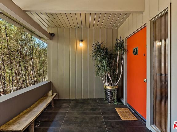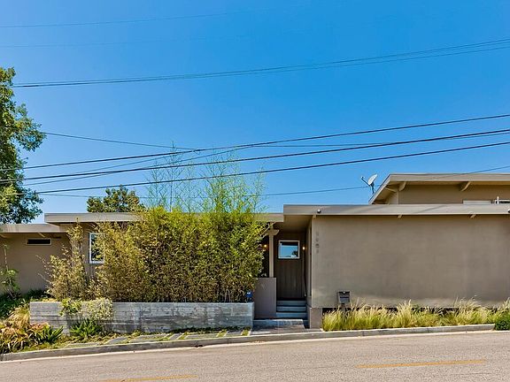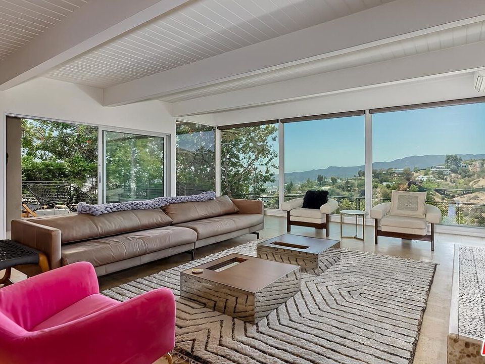 Situated on Brentwood's renowned Tigertail Road, this mid-century masterpiece has been completely upgraded with modern amenities, all while maintaining the clean lines and sophisticated details that go along with the property's 1955 origin. Spanning nearly 4,000 square feet of living space, the home includes four bedrooms with an additional den/office, five full bathrooms, and one-half bathroom, while resting upon a 13,570 square foot lot, with expansive west-facing vantage points. The original natural wood paneling, cork flooring, three-sided fireplace, and beamed ceilings have all been meticulously preserved while contemporary upgrades like designer tiles, a streamlined chef's kitchen, and bright pops of color, evoke a luxurious yet period-appropriate aesthetic. Floor to ceiling windows and sliding glass doors frame the sweeping views across the canyon to the Pacific Ocean while offering a seamless indoor/outdoor flow. Outside, there are numerous areas for lounging and dining with a wrap-around patio while the terraced property and grassy yard offer the opportunity for any future recreation desired. Additional highlights of the property include an original outdoor brick oven, custom soundproof recording studio, distinctive designer finishes, and a 2-car garage.