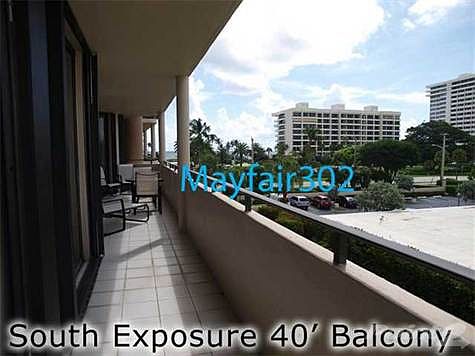 BRIGHT SOUTHERN EXPOSURE W/ OCEAN VIEW FROM HUGE BALCONY, THIS SPACIOUS, WELL MAINTAINED 2 BR 2 1/2 BATH CONDO OFFERS TREMENDOUS VALUE AND ABUNDANT SPACE IN AN ARCHITECTURALLY SIGNIFICANT BOUTIQUE BUILDING OF ONLY 55 UNITS. ALL BR'S AND LIVING AREAS ADJOIN APPROX. 44 FT. OF BALCONY OFFERING MAXIMUM SUNLIGHT & COOL BREEZES. SUBSTANTIAL MASTER BR SUITE & BATH HAS JACUZZI & SEPARATE SHOWER, DRESSING AREA & AMPLE CLOSET SPACE. LARGE 2ND BR HAS BATH EN SUITE. SPACIOUS EAT IN KITCHEN W/ PANTRY. EXPANSIVE LIVING & DINING RM HAS COMFORTABLE EASY FLOW. THE MAYFAIR IS CENTERED AROUND A MAGNIFICENT ATRIUM, A TROPICAL OASIS OF WATERFALLS & FOLIAGE. INCLUDED IN MAINTENANCE IS 24/7 SECURITY, SERVICE CONTRACT FOR REPAIRS & MAINT. OF UNIT, POOL, TENNIS, FITNESS RM, BEACH ACCESS, GARAGE PARKING