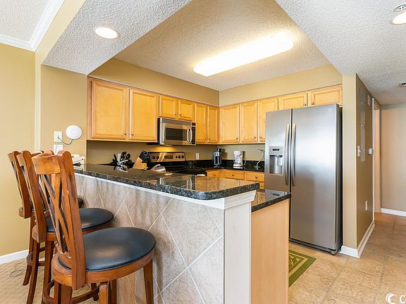 OCEAN FRONT CONDO Grab this 3 bed/3 full bath, fully furnished oceanfront unit. Never rented in amazing condition and used as a second home, you will love the fact that this unit sleeps 10. Master bed has an oceanfront balcony, king bed, ensuite bathroom with separate shower, jetted tub, double sink granite vanity and double closets. Family area has a pull out sofa and a balcony to the ocean front. Large dining area with breakfast bar. Granite continues into kitchen countertops with stainless steel appliances and tile floor. This unit has a full size washer and dryer and 2 additional full bathrooms. Bedroom number 2 has two full size beds and bedroom number 3 has 2 twin beds. Additional finishes include crown molding throughout, carpet in the bedrooms and living room and tile in all the wet areas and hallway. Additional beach storage to the right of the front door includes the unit’s water heater. The condominium complex offers private ocean front coded access, hot tub, outdoor pool, indoor pool, grilling area outside and a coded entry fitness center on the same level as the unit. Perfect oceanfront location where you can walk to local pubs, minutes from Barefoot Landing dining, shopping and entertainment to the south of the condo and minutes from Robert Edge Parkway, which is the entrance to North Myrtle Beach with all the box store shopping and North Myrtle Beach points of interest.
