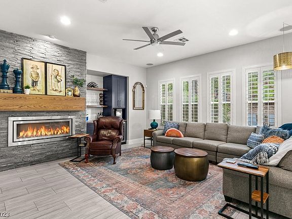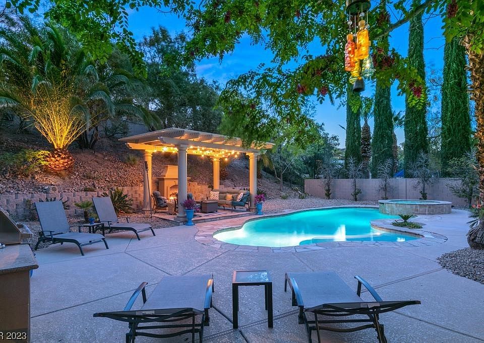 Welcome to the highly desirable Summerlin guard-gated community, The Vineyards. This popular Christopher home model has been completely remodeled, including the kitchen which was just completed in January 2023! This large interior lot boasts complete privacy, including a backyard oasis with a pool, spa, half basketball court and a covered outdoor sitting area with a fireplace. The newly remodeled kitchen includes new cabinets, quartz countertops, and stainless steel appliances, including a GE Cafe french door oven and new Bosch Dishwasher. New tile flooring throughout the downstairs. Home includes water softener and reverse osmosis water system. All 4 bedrooms have espresso hardwood. The Main-level includes the primary suite w/backyard access right to the pool/spa. The primary bathroom includes dual vanities, beautiful countertop, oversized shower, & walk-in closet w/custom cabinetry for plenty of storage space. This home is a must see!