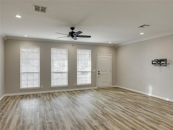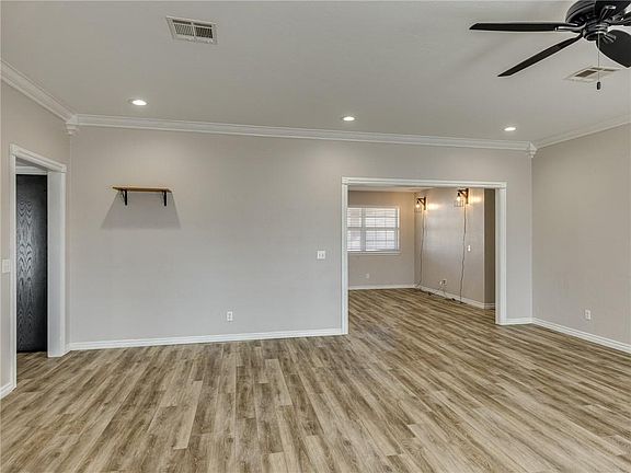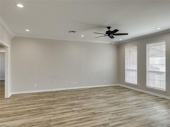 Large living room with crown molding. Floor to ceiling windows offer wonderful natural lightning. Spacious kitchen and dining area, granite counter tops with tiled backsplash. Split bedroom plan with oversized owner's suite and deep walk-in closet. Owner's bath with tub/shower, oversized double vanity with granite counter plus floor to ceiling linen cabinet. Spacious guest bedrooms, hall bath with tub/shower, single vanity with granite counter and 2 hall storage closets. large inside utility room with sink and above cabinet storage. Gray paint tones with white painted cabinets and trim. Wood plank laminate flooring through-out except utility and baths have tile flooring. Large back yard with covered patio, wood privacy fence, 2 storage buildings. Garage floor has storm shelter.