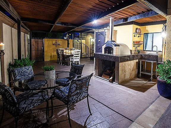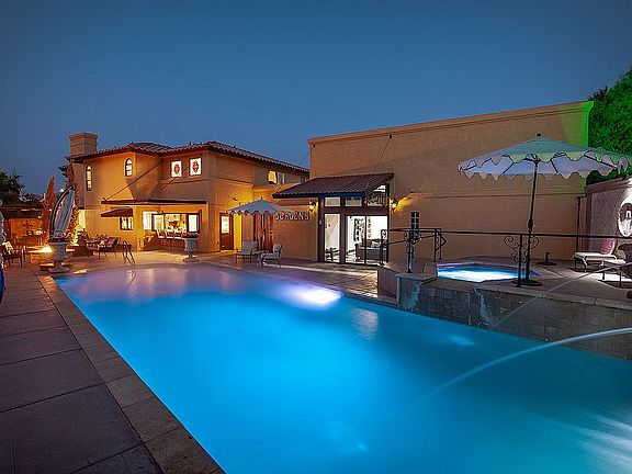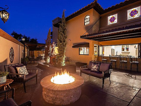 Stunning Mediterranean Tuscan property with resort style grounds. Two gourmet kitchens with viking appliances. Second kitchen has accordian windows/bar that open to the largest pool & spa, gas fire pit & tons of shade. Built in Professional smoker & pizza oven. 1327 SF finished garage is climate controlled (holds 4 cars) & 2 car garage. Guest house with 3/4 bath that opens to pool area. Office with built ins & craft room.