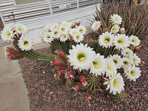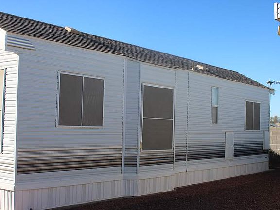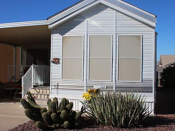 This charming, 1 bed 1 bath Park Model home at Quail Run RV Resort in Arizona City was built in 1997 by Cavco. The home features a cozy living room, a spacious master bedroom, a fully-equipped kitchen with a breakfast nook, a convenient laundry room, and an inviting Large Arizona Room perfect for relaxation. The exterior of the home boasts a carport, shed, deck, patio, trees on the property, covered porch, and Concrete driveway. Inside, the home is equipped with essential appliances such as an oven, fridge, microwave, washer, dryer, and hot water heater. Additional features include washer/dryer hookups in Arizona Room, central A/C, forced air heating, and electric fixtures. New Roof 2025. Comes with Pest Control thru December of 2026.Quail Run RV Resort is a vibrant community in Arizona City offering a variety of amenities for residents to enjoy. The resort features a clubhouse, swimming pool, fitness center, tennis courts, and walking trails for outdoor recreation. Residents can also socialize with neighbors at community events and activities or relax in the peaceful desert surroundings. The resort is conveniently located near shopping, dining, and entertainment options, providing a comfortable and convenient lifestyle for residents of all ages.