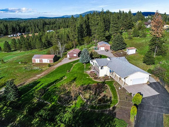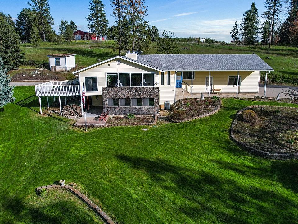 Enjoy country living at its finest in this beautiful 4+ bed 3 bath rancher with spectacular views on 4.13 acres of well-manicured land with a 2-car garage, multiple shops, and a barn. This 3100+ square foot home includes 4+ beds including a bonus room/office, 3 baths with fresh paint and flooring throughout. The main floor features a spacious living room with panoramic views, 3 beds, 2 baths, laundry, kitchen, and dining room. Step downstairs into the walk-out basement where you will find an oversized family room, a bedroom with an attached bath, and a bonus room/office. Other features include a 24'x36' shop, 24'x36' heated workshop, 26'x48' barn, and the house is wired to run on a generator. Enjoy your oversized deck and the beautiful setting provided by just over 4 acres of prime land which is perfect for livestock, your own family farm, and entertaining friends and family. Conveniently located within 10 minutes of the South Hill and Spokane Valley with easy access to the Palouse Highway and Highway 27.