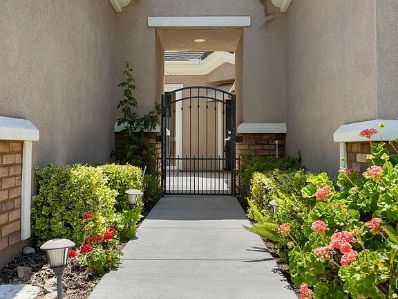 Spend the best years of your life in beautiful Solera 55+ Community! This spacious split wing 2 Bedroom, 2 Bathroom + Office home features mountain views, lovely exterior brick accents, mature landscaping, and Courtyard Entry. Enter the foyer and view the open concept living room, kitchen and breakfast area. Kitchen features a sliding door to the courtyard, granite countertops and island with pendant lighting, ample cabinet space and a pantry! The laundry room includes cabinets as well as a sink. The primary suite features step-in shower, separate tub, dual sinks and walk-in closet. The double-door entry office includes a closet that can be used as a third bedroom. You'll find your sanctuary from the summer heat in the backyard with lovely shade trees, a covered patio, window awnings and a white vinyl fence. The community amenities will keep you entertained and active with pickleball courts, pool/spa, clubhouse, and so much more!