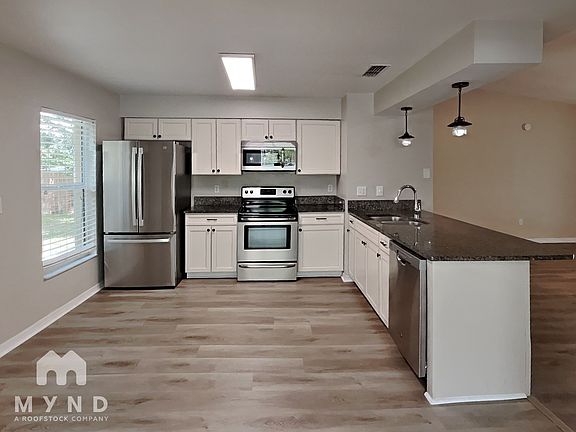 This fantastic 3-bedroom, 2-bathroom home at 14013 Fullerton Dr offers 1,328 sq. ft. of comfortable living space, featuring an open-concept layout with a bright living/dining area and a modern kitchen complete with white cabinetry, stone countertops, a breakfast bar with seating, and a full suite of stainless steel appliances. The primary bedroom includes an en-suite bath and walk-in closet, while a versatile bonus room upstairs can serve as a den or home office. Additional highlights include smart home features (Smart Lock, Smart Thermostat, Smart Hub, Motion Sensor), washer/dryer hookups, an attached garage, and an enclosed patio overlooking a fenced backyard perfect for relaxing or entertaining. Located near FL-589 and Ehrlich Rd, with easy access to shopping, dining, parks, and local amenities. Schedule your tour today!