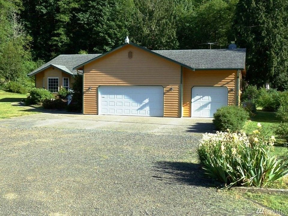 Custom rambler on 10+ acres with a picturesque setting that is nestled up to Ebey mountain! Almost 2000 square feet that offers a spacious kitchen w/ propane cook top, garden window, tons of cabinets & counter space. Family room is open to kitchen & features vaulted ceilings, skylight & river rock fireplace. Lg master bedroom has a 5 piece private bath & walk in closet. Full length deck w/ hot tub. Spectacular grounds with tons of perennials, fruit trees & berries. Green house & cold smoker too.