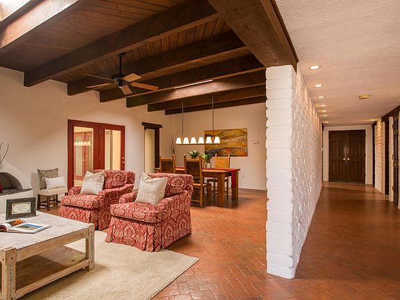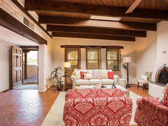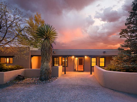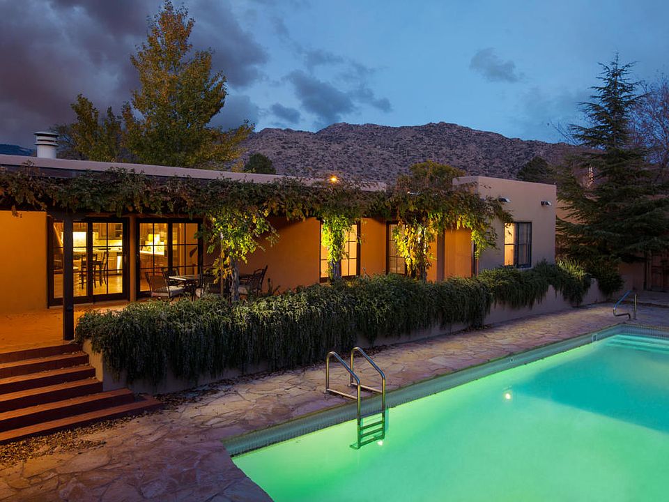 Nestled in the foothills with easy access to I-40, this gorgeous adobe home has all brick floors, wood beam ceilings and beautiful Mexican tile countertops for a warm and unique home. A private yard complete with a waterfall feature pouring into the sparkling pool, is completely secluded with mature landscaping and walled backyard. Numerous, cozy living spaces provide the option for an in-law suite or multigenerational living. An oversized garage and spacious workshop, TONS of room and more storage on the side. Kitchen has all new stainless steel appliances and a distinctive wood burning fireplace. Living and dining room flow together with a kiva fireplace, natural light and cozy, yet spacious living. Tastefully renovated by two architects, this home is perfect for entertaining and living!
