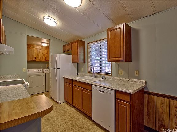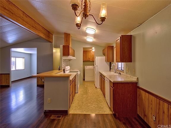 CUTE & CLEAN 2 BEDROOM, 2 BATHROOM MANUFACTURED HOME WITH BONUS ROOM! Great vaulted ceilings in the living room, dining room & kitchen with desirable open floor plan. Efficient wood burning stove in living room. Bonus room can be used as an office or 3rd bedroom. Spacious master suite offers large closet with shower. Indoor separate laundry room with storage with access to back deck overlooking greenbelt area. Well maintained home featuring dual pane windows with blinds, newer flooring, newer appliances, updated counter tops & more. Large 2 car garage with work bench area.