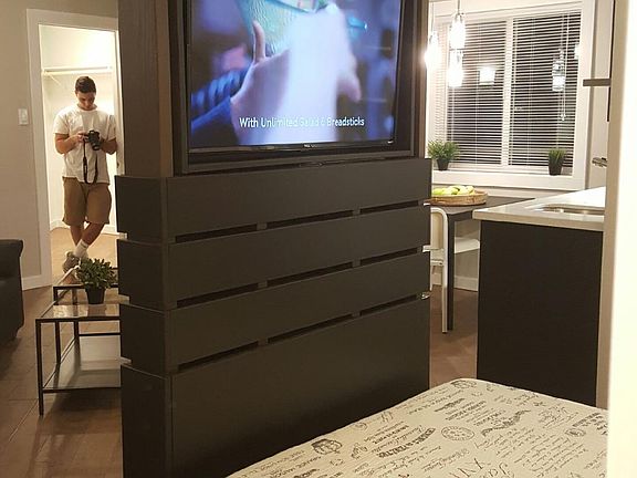 Rotating television between bed and living room. Full size bed with nightstands. LED Lighting. 3rd Floor unit with beautiful view. 2 large walk-in closets for extra storage. Assigned off-street parking.