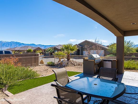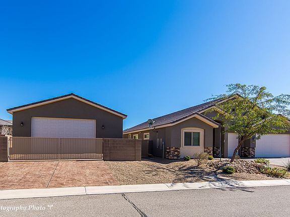 If you have ever dreamed of owning a model home, this is your chance. This beautifully FURNISHED Stone Haven home is absolutely gorgeous and everything in the home stays, from the art on the walls down to the blender. Move right in! Not only is the home incredible, the 2,564/SF of garage space is a dream. The 3 CAR is spacious and the detached RV GARAGE is 30 X 56. This man cave has heating and AC and a full bathroom. The eastern orientation is ideal and the mountain view is awesome. Enjoy Mesquite's beautiful weather from the spacious covered patio and grill on the built-in BBQ. The floor plan is open and the ceilings are vaulted. The home is beautifully appointed with granite tops, stainless appliances, stone floors and warm paint tones. The kitchen cabinets, backsplash and lighting are beautiful. The hidden walk-in pantry allows plenty of room for storage. The master bathroom has a large walk-in shower and attractive tile accents. The yard is enclosed with a privacy wall and iron fence. The rock exterior accents and stained concrete add character and the desert landscaping is low maintenance. Simply move in and/or add the home to the short term vacation rental pool.