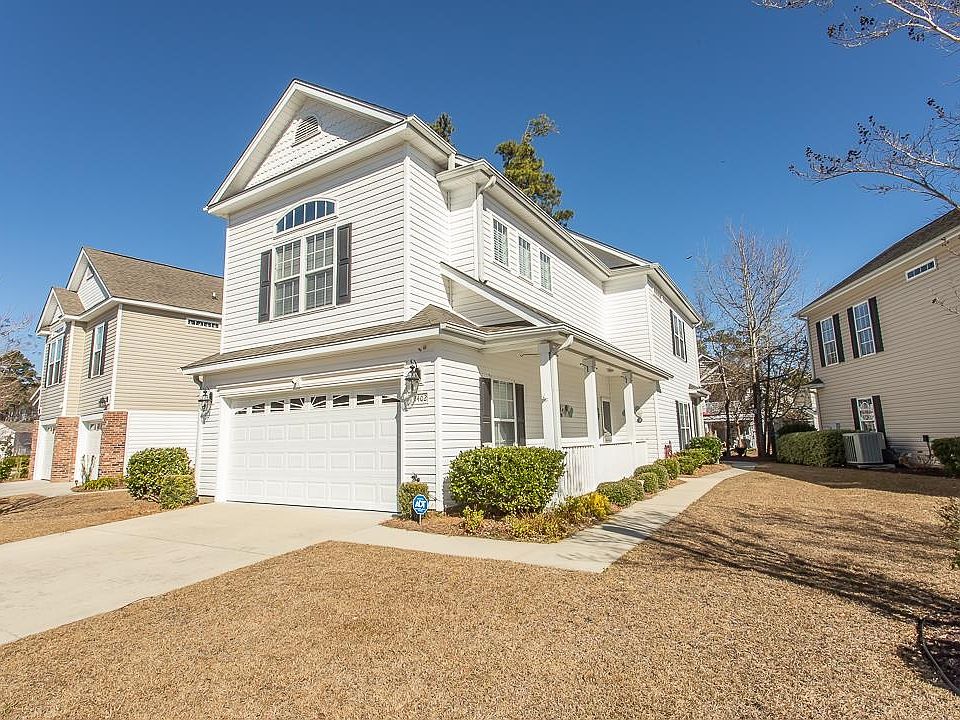 Beautiful raised beach home in The Cottages on Farrow.  Unique home with side porch and back patio with first floor living and entertaining.  Formal dining room with wainscoting, kitchen open to living area featuring granite, tumbled stone backsplash, stainless steel appliances.  A half bath is also located on the first floor.  Elevator shaft is being used as storage on both floors.  Three bedrooms and two baths are located on the second floor.  Master bedroom has wood floors, tray ceiling with fan.  Master bath offers dual vanities and walk-in shower.  The carpeted guest bedrooms have ceiling fans and walk-in closets for lots of storage.  Screened in porch and back patio for more outdoor enjoyment.    Close to all that Market Common has to offer.