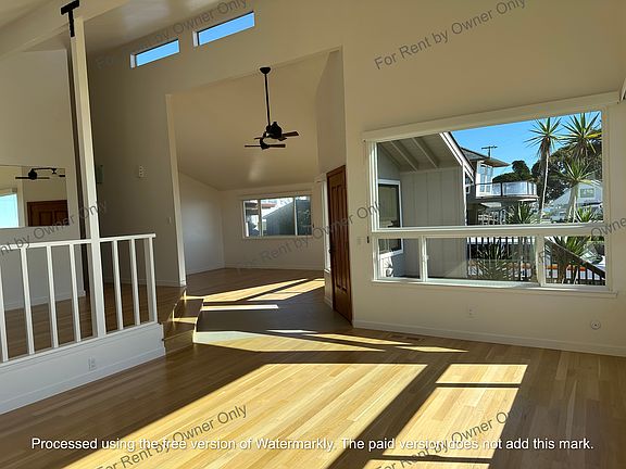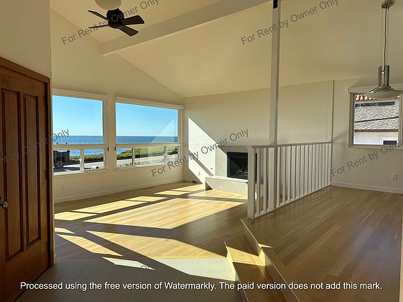 Rare ocean-front property on West Cliff Dr for rent; just steps to coastal walkway and beach access at popular surf spot. Large south-east facing corner lot with panoramic scenery, elevated front deck, side garage entrance, mature landscaping, and secluded back yard. Contemporary multi-level home designed to maximize views yet maintain privacy. Spacious living area with high ceilings and ample natural lighting from windows. Floor plan includes 2 bedrooms and 2 full bathrooms, kitchen, dining room, living room and family room: