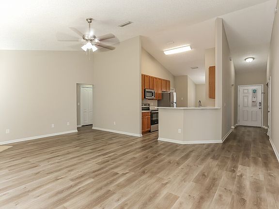 Please note, our homes are available on a first-come, first-serve basis and are not reserved until the lease is signed by all applicants and security deposits are collected. This home features Progress Smart Home - Progress Residential's smart home app, which allows you to control the home securely from any of your devices. Want to tour on your own? Click the "Self Tour" button on this home's RentProgress. This three-bedroom, two-bathroom rental home in Jacksonville has plenty to offer, including a pet-friendly enclosed yard and a renovated interior. You'll love how spacious the living room is. It comes with a charming corner fireplace, a vaulted ceiling, and plenty of natural light from a set of sliding glass doors leading outside. Serve casual meals at the breakfast bar in the kitchen, and enjoy cooking using the top-quality stainless steel appliances. The overhead microwave helps to save space. There's a large walk-in closet and luxury vinyl plank flooring in the master bedroom. Enjoy having both a bathtub and a shower in the en suite bathroom. Come take your in-person tour soon!