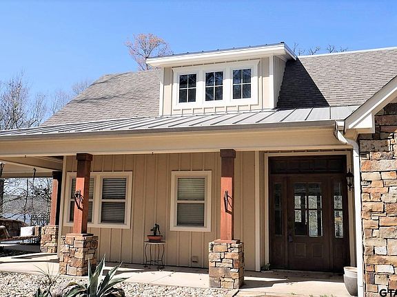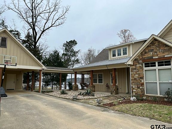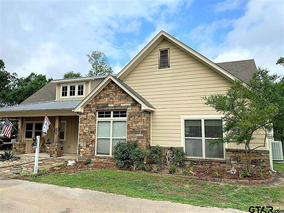 Waterfront Living on Old Lake Tyler - This 2008 Custom Build by Stricklin Homes Main residence boasts 2240 sq ft 3/2 with office and bonus sunroom (could be 4th bedroom) wrap around porches, oversized back porch Craftsman style features stone clad exterior and cedar detailing with side entry 20 x 20 detached 2 stall carport with covered walkway accessible storage was built to accomodate future expansion of a 220+ sq ft upstairs bonus room. Interior features vaulted ceilings, hardwood floors, custom wood cabinetry, granite countertops, and stunning views with personal access of over 150 ft of Lake Tyler shoreline complete with fishing pier and covered boat slip. A 30 x 40 Barndo features 1/1 efficiency apt. ideal for MIL , guest house or personal event locale with 2 car garage. Situated on a nicely wooded 2.98 acres this property provides the best of lakefront living and privacy within 10 mins of Tyler and Whitehouse.