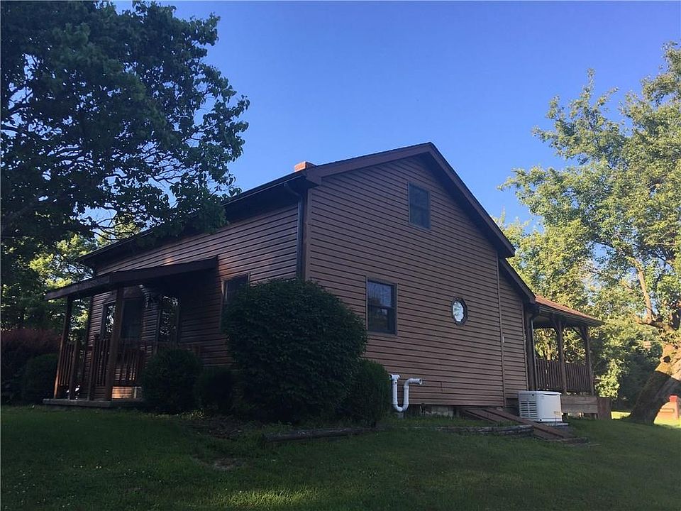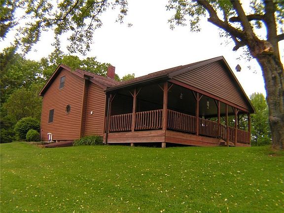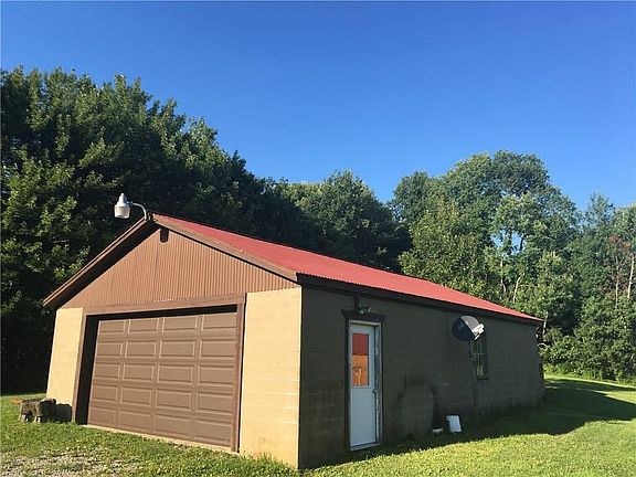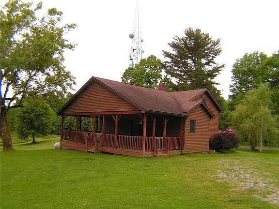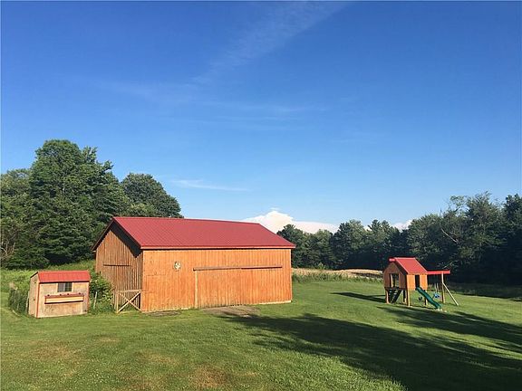 Incredible setting with updated home along with 30'x40' restored barn, 24'x36', 4-car garage, 8'x12' shed, chicken coop and a cabin (sleeps 6) in the woods on 50 acres! New 200 amp service, new boiler & outdoor wood furnace. Home has first floor full bathroom & laundry. Large living room & eat-in kitchen w/ pantry. Huge covered back porch overlooking the incredible setting. Yard features covered picnic pavilion and swing set! Rolling land adjacent to state game lands!