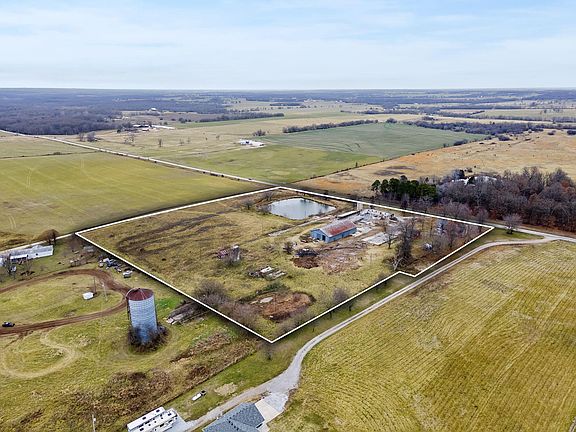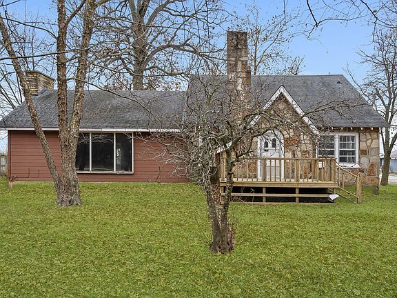 Unique farm property with multiple outbuildings on almost 11 acres!! Main house features a front deck w/stone + wood exterior. Large living room with wood burning stone fireplace. Kitchen offers ample cabinet space. Main floor primary bedroom with attached bathroom. There are 2 more bedrooms, one on the 2nd floor w/hardwood floors, and a full bathroom. Extra space available in the unfinished basement. On the property is a large metal building and a 2 car detached garage. The acreage is stunning with a circle drive, large pond, and level pasture area. Located next to Boz's Berry Farm, with quick access to I-44.