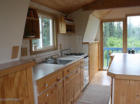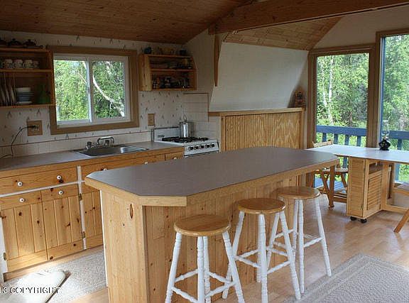 Beautifully finished ''upside down'' cabin near popular Kenny Creek Lodge, in heart of great snowmachine area just a few miles off Petersville Rd. Bunkroom and master BR plus ''bath'' with port-a-potty on main floor, living/dining/kitchen on 2nd floor. Peekaboo view of McKinley, views of Talkeetna Mtns to east and open views to south. 5' high storage area under cabin. Fully furnished, owner finan