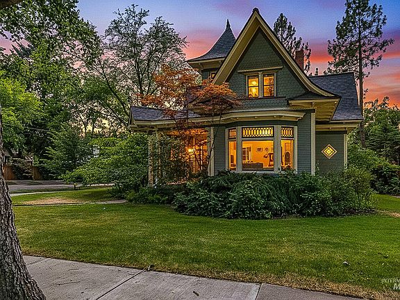 Stunning example of historic North End architecture, this ornate Queen Anne cottage showcases rich character and distinctive detail. Built in 1902, the home features a striking square tower, graceful columned semi-circular porch bay windows, and multiple intersecting gables with flared eaves. Leaded glass, ornamental window shapes, and decorative shingles further enhance its visual appeal. Inside, timeless craftsmanship shines with original inlaid hardwood floors, a cozy fireplace, and a turret room that adds a whimsical touch. The formal dining room offers an inviting space to gather, while thoughtful updates provide modern convenience without compromising historic charm. Nestled on a tree-lined street just blocks from Hyde Park, local dining, boutique shopping, and beloved Boise parks—this rare gem offers incredible curb appeal and enduring value in one of the city's most treasured neighborhoods.