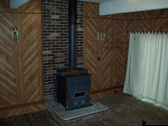 Three bedroom home on corner lot featuring family room, living room, eat in kitchen and detached garage.