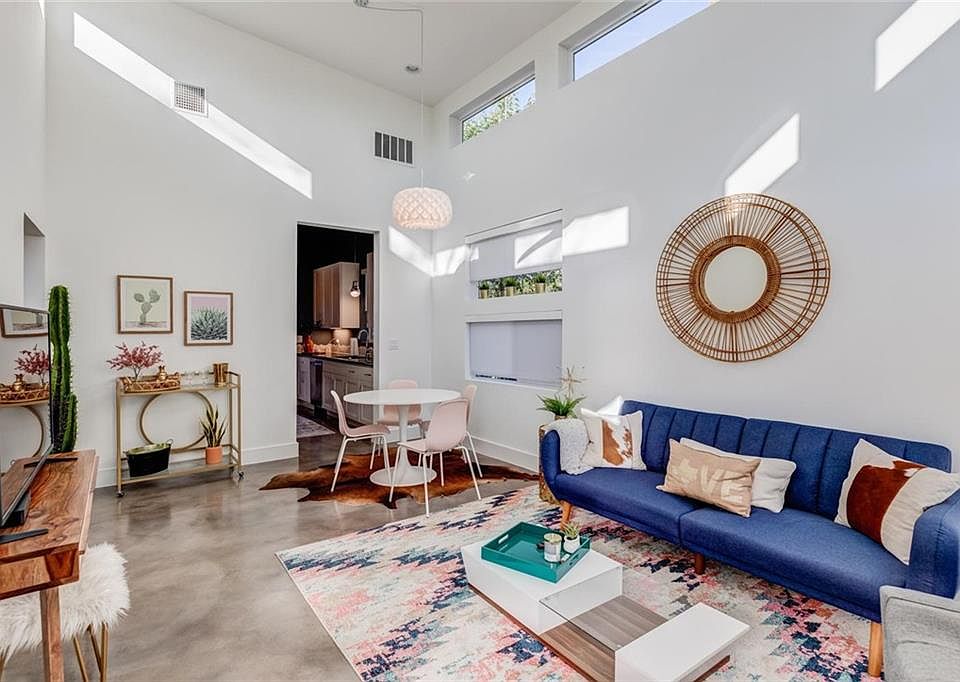 Darling house in the heart of central East Austin made large w/ soaring ceilings & walls of windows! This trendy newer build includes 2 beds/2 full baths, open living, ample space, custom cabinetry, Nest thermostat, google fiber, fridge & washer/dryer. His & her closets in master. Easy outdoor living w/ multi-use carport, balcony off master, porch off kitchen & private yard. Entry off alley makes for a treehouse feel- see attached for entry instructions. Owner flexible on furnishings & lease term.