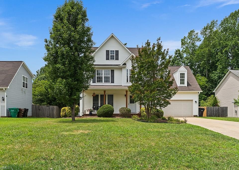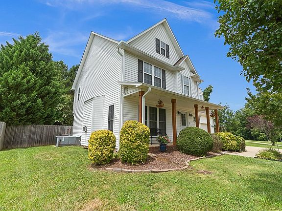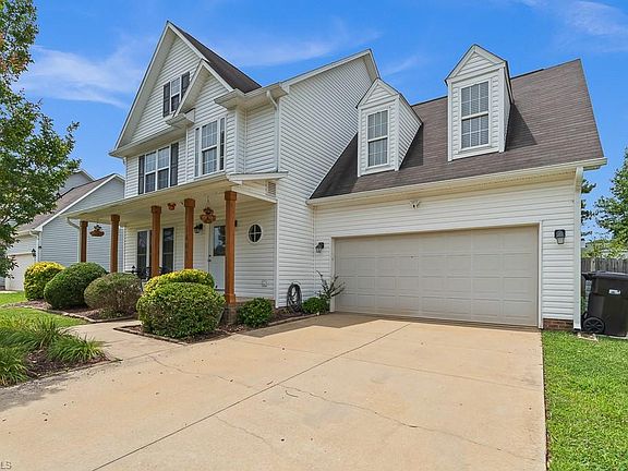 Cute house with rocking chair front porch located on a cul-de-sac. Remodeling includes wood floors on both levels and updated kitchen and bath. Open plan for living, dining and kitchen area. Tall windows provide lots of natural light to the living area. Just outside the kitchen, you can enjoy the privacy-fenced back yard from your deck or patio with overhead trellis. Primary bedroom feature tray ceiling and adjacent bath with dual sink vanity, garden tub, separate shower and large walk-in closet. Huge 20' x 17' bonus room serves as a playroom or fourth bedroom. Storage building is perfect for lawn equipment. Garage is also large enough for 2 cars and storage. -
