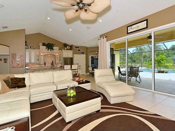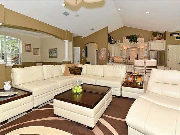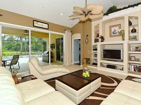 Inspection completed! This house is perfection... Absolutely everything in impeccable condition. This is a 3 bedroom plus den, 3 bath home. This open GREAT ROOM floor plan includes a Dining Room and eat-in kitchen. Built-ins in Living room. Master bedroom with a view of pool of the pool area and has a huge 17'x7' walk in closet. Three car garage has 2 car door in front and one car door in back for an untraditional garage set up. Large laundry room around the corner from dry bar with small fridge perfect for beverages. Wine fridge in kitchen as well. Home has Ample Storage throughout. Security system is ready to be activated. Salt water Pool and spa has an expansive lanai that includes great views of the lake with treed privacy. The backyard concrete fire-pit area that is ready for memories to be made. Yes, the backyard is a true Southern exposure! Family park with a playground is just up the road with more lake views, and covered area for picnics and basketball courts for family fun! Pictures are shown with owners furniture. Currently Vacant and move in ready!!!