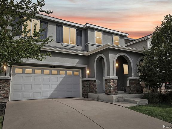 This sweet Fallbrook Farms 2 story has 4 beds/3baths and a professionally finished basement! Tons of cool features in the home - office/flex space/playroom with custom built-ins off the open entry up front, private powder bath, hardwood floors stretching from the open entry through the large, open kitchen and dining area. You get TONS of cabinets and counters, huge composite single bowl sink ans SS appliances – great space for family dinners or entertaining guests! Great family room with a cozy fireplace, lot of sun filled windows and a killer built-in entertainment center – perfect for game nights/movie nights/Sunday Night Football! Upstairs you can retreat to your primary suite or relax in your 5-piece bath with large shower, soaking tub, separate sinks and great walk-in closet! Makes mornings a breeze! 3 large & bright bedrooms with large shared bath in the hall are great to get kids or guests ready for the day! Professionally finished basement for TV/movies/exercise room/play area/man cave? Bonus room totally works for home office/playroom/craft room or? HUGE storage room for all your treasures! HOA takes care of front yard maint. & watering, low maintenance back yard has new Trex-style deck with sleek black metal railing – hang out, cook out, or use the concrete patio for a fire table and have a drink! Near too many conveniences to list, parks, trails, 5 Star schools, shopping restaurants, Trailwinds Rec Center, Orchard Mall, Denver Premium Outlets, lightrail, I-25 & E-470, Top Golf and SO MUCH MORE! This could be for YOU!