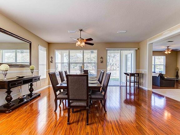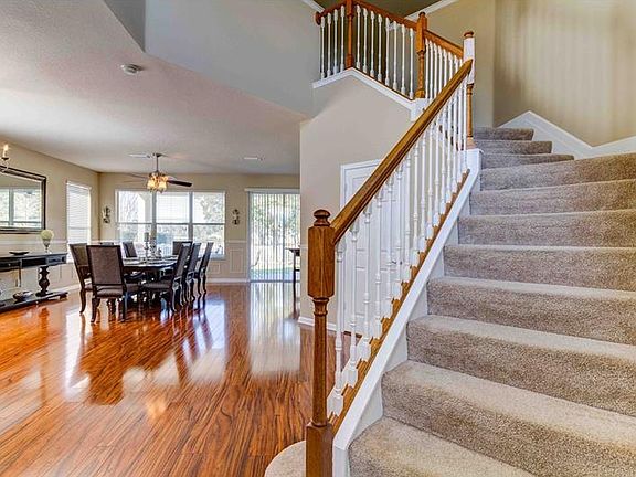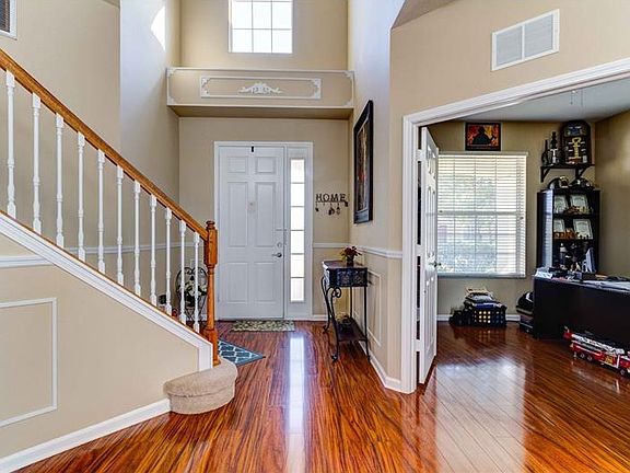 -Stunning, spacious home! Office can be used as 5th bedroom! Walking into the home you are greeted with an entryway displaying a staircase and to the left an office. Beautiful formal dining room, half bath and family room on the first floor. Both rooms include warm inviting wood laminate flooring. Kitchen is large with center island, wood cabinets and tile floors. Upstairs you will find all of the bedrooms. All bedrooms are spacious and have carpeting. Master suite has double door entry, two walk-in closets and a tray ceiling. Master bath has garden tub, separate shower and double sinks. Back lanai overlooks a fully fenced-in yard.