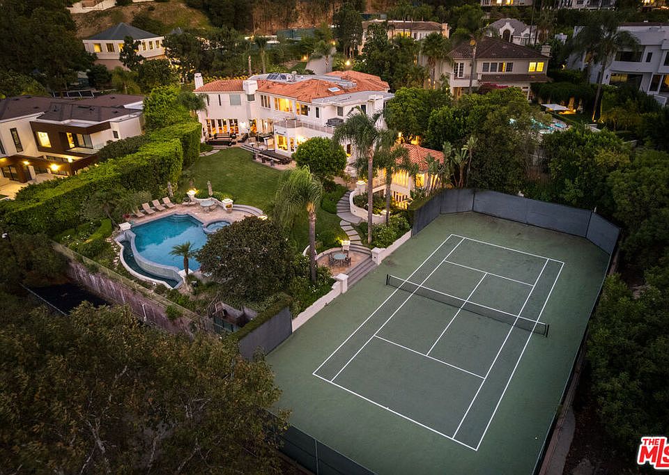 One of the premier view properties in Mulholland Estates, this private Art Deco estate spans 1.3 acres and showcases sweeping city light vistas and verdant hillside scenery. Situated within one of the most coveted guard-gated communities, the residence is defined by soaring ceilings, elegant proportions, and timeless design. Grand formal living areas flow seamlessly into a gourmet kitchen with a dedicated prep space, while floor-to-ceiling glass doors open to an infinity pool, full-size tennis court, and expansive indoor-outdoor entertaining areas. The home also features a private staff wing, gym, elevator, 10-car garage, and a dedicated entertainment level complete with a professional theater, game room, wine room, satellite kitchen, and offices. A detached two-story guesthouse completes this rare and refined offering. 14035 Aubrey blends architectural elegance with resort-style amenities in an unparalleled setting.