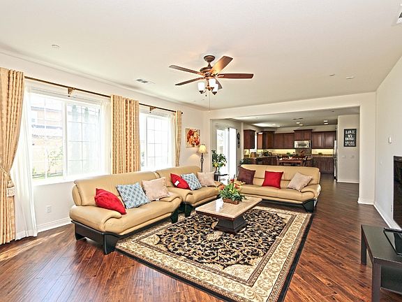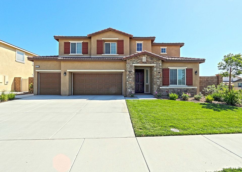 New home resides in the highly desirable Riverglen Community of Eastvale, built in 2013 by D.R Horton. Beautiful Curb Appeal sits on a corner lot. This home is very bright and airy. Open floor plan with lots of windows. Elegant and well-designed upgrades throughout this home. Saddle finish cabinets with granite counter tops, center island and GE stainless steel appliances in the large entertainment kitchen that opens to the LARGE great room. Beautiful upgraded diagonal wood and tile flooring. Recessed lighting, ceiling fans and much more. One bedroom and full size bathroom downstairs. High ceiling at the entrance. Master bedroom has separate shower and bath tub, large walk-in closet. Large landscaped backyard. Conveniently located next to Eastvale Community Center. 10 mins walking distance to schools, including Rosa Parks Elementary (GreatSchools rating: 9 out of 10), shopping, and dining.
